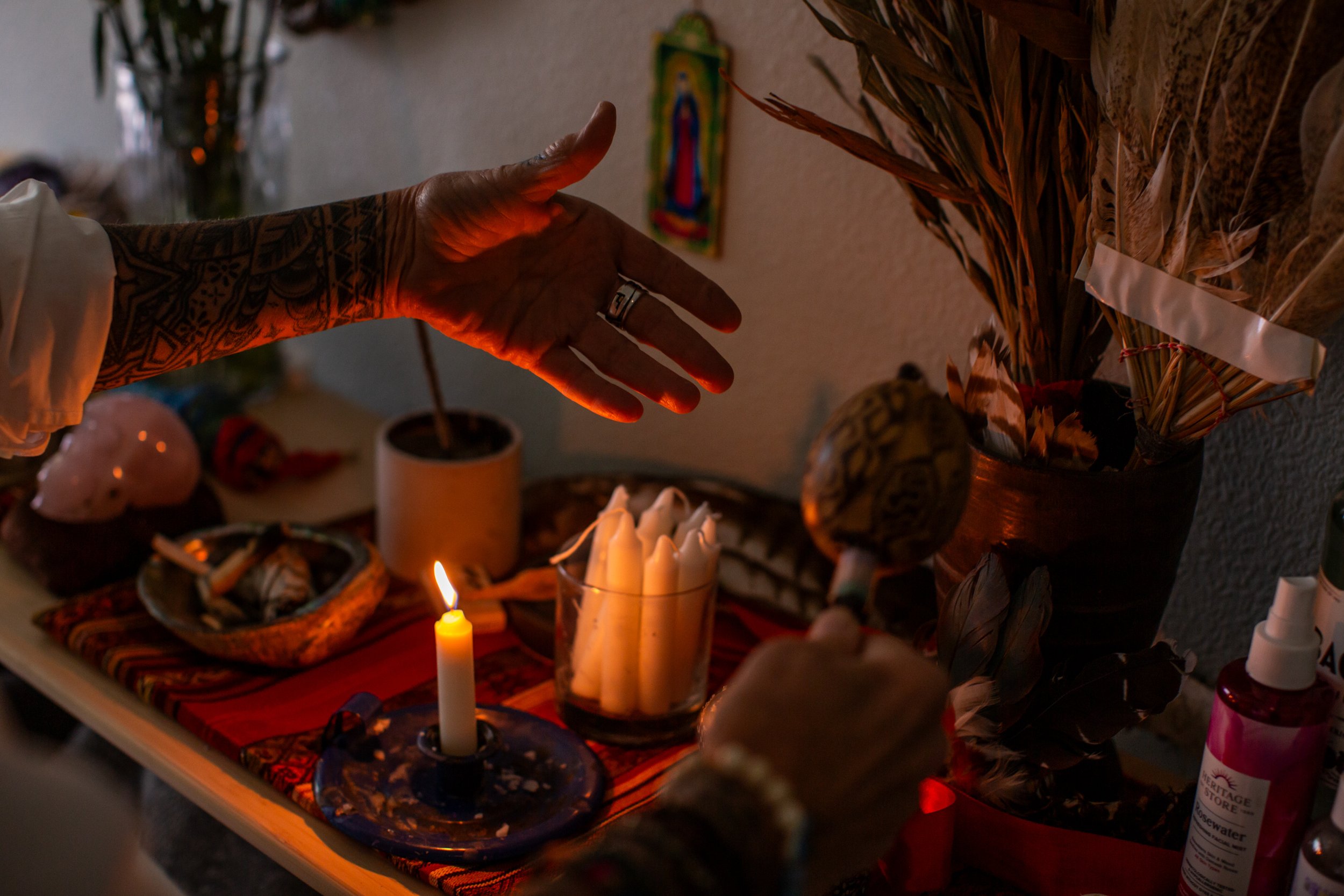An energy clearing using plants, flowers, herbs, oils, smoke, fire, breath, eggs, feathers, stones, trago (botanically infused waters), tacuma needles, energy & sound clearing and crystals.
